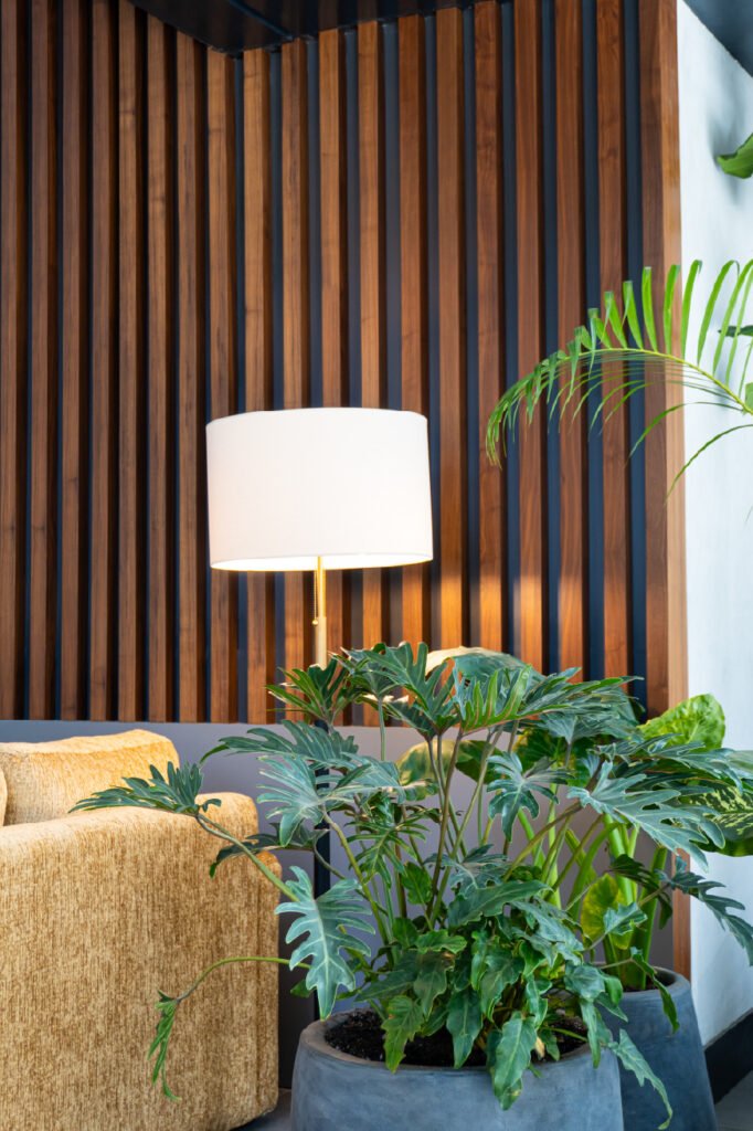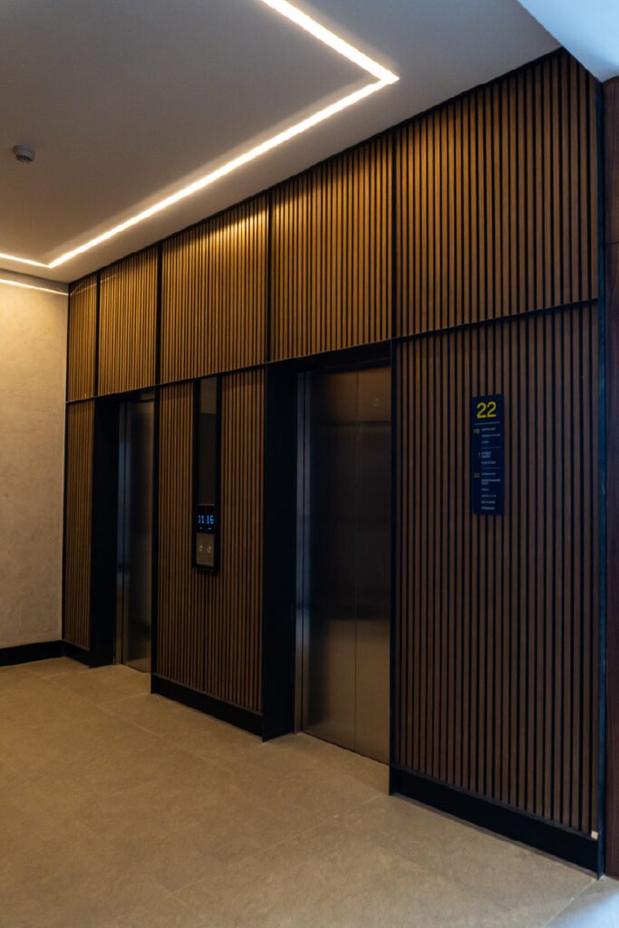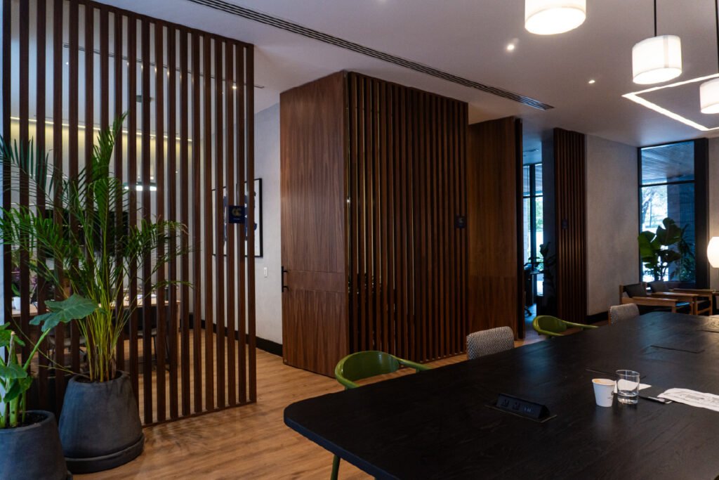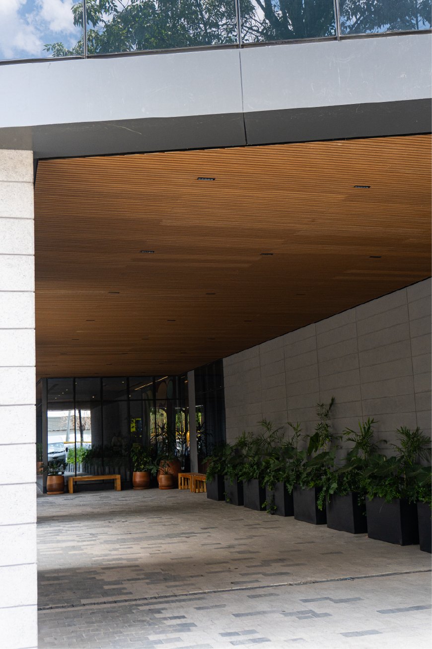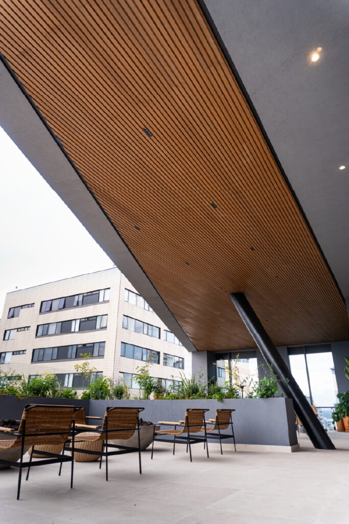 Desarrollo de acabados interiores y exteriores para Neuchâtel Cuadrante Polanco, integrando lambrín decorativo, vigas tipo madera y soluciones arquitectónicas que aportan calidez, continuidad visual y un diseño contemporáneo de alto nivel en áreas comunes y espacios corporativos.