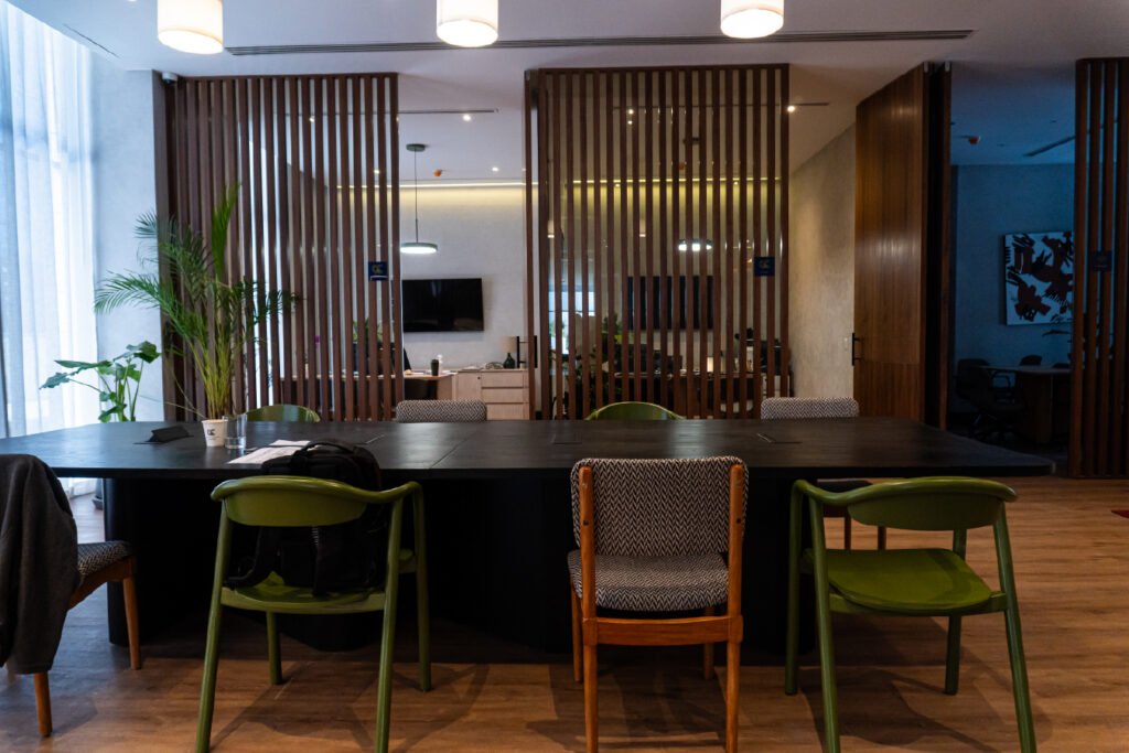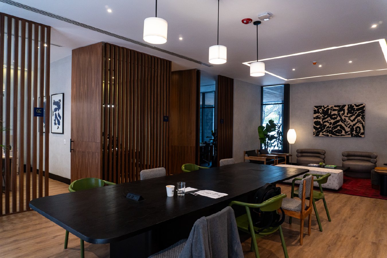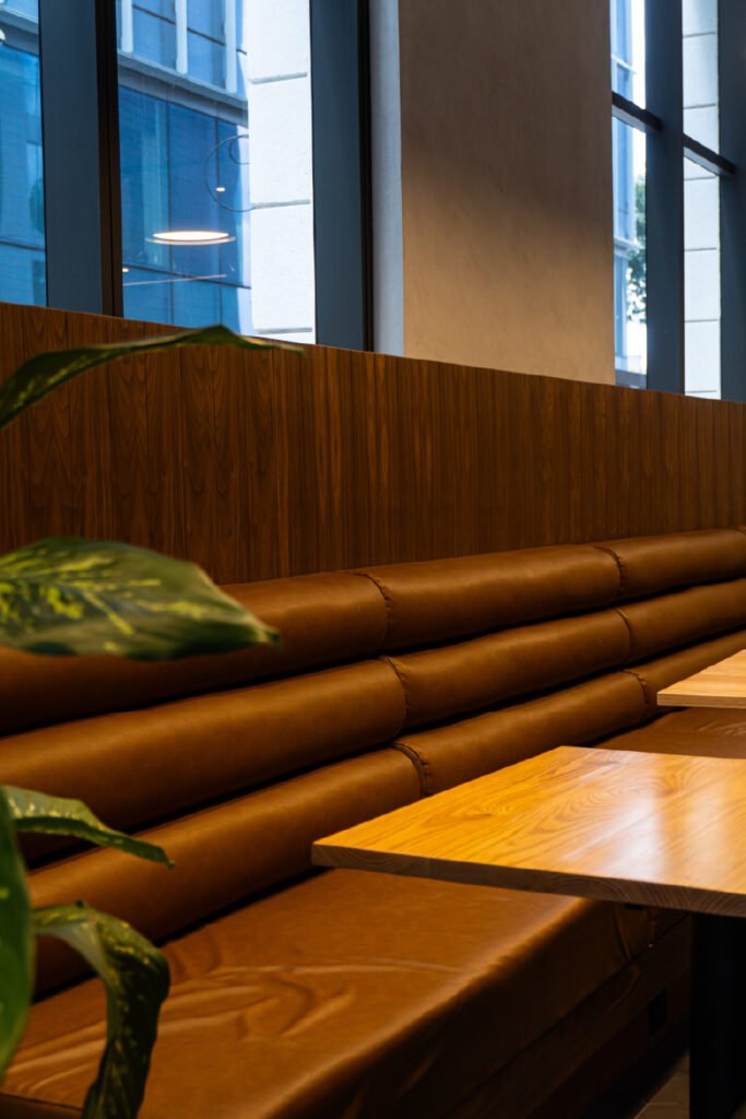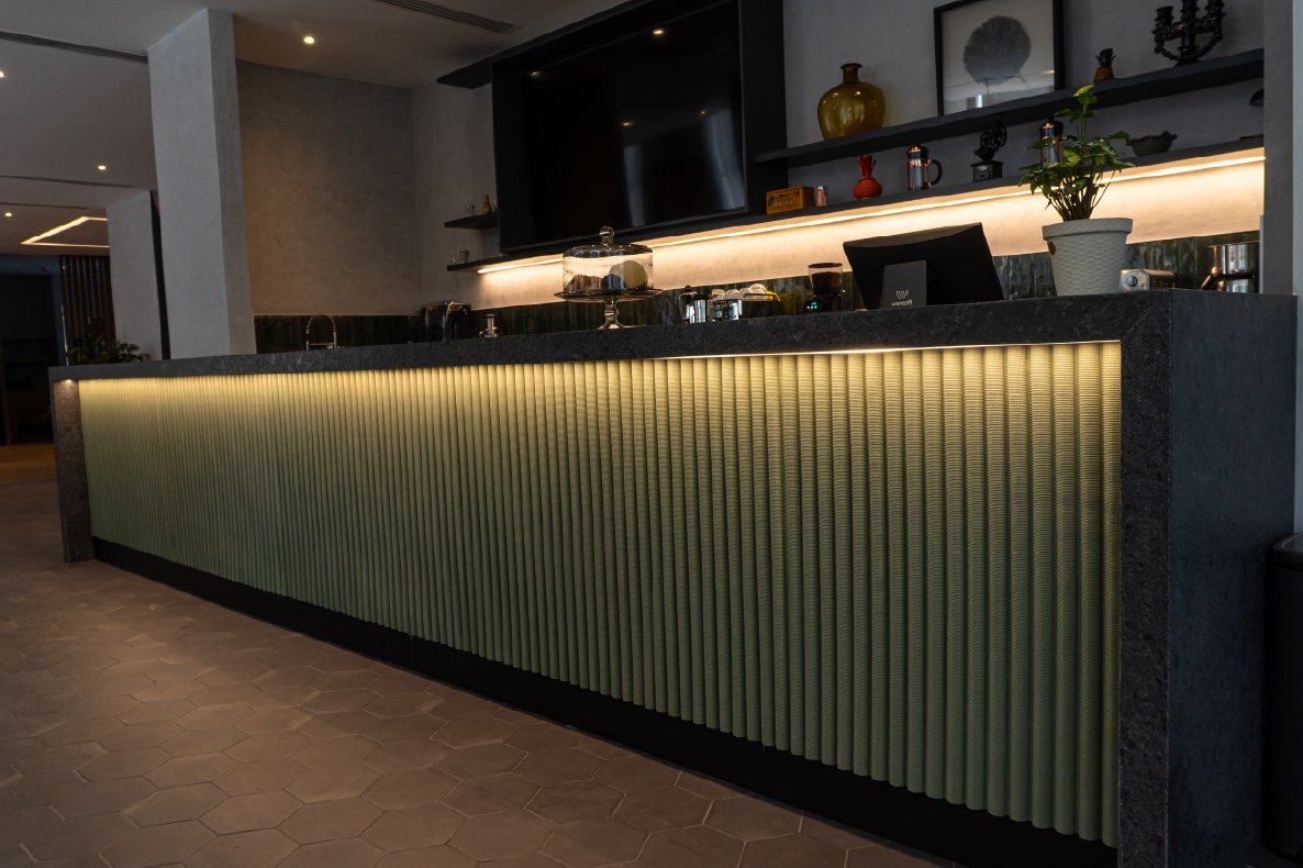 Desarrollo de acabados interiores y exteriores para Neuchâtel Cuadrante Polanco, integrando lambrín decorativo, vigas tipo madera y soluciones arquitectónicas que aportan calidez, continuidad visual y un diseño contemporáneo de alto nivel en áreas comunes y espacios corporativos.