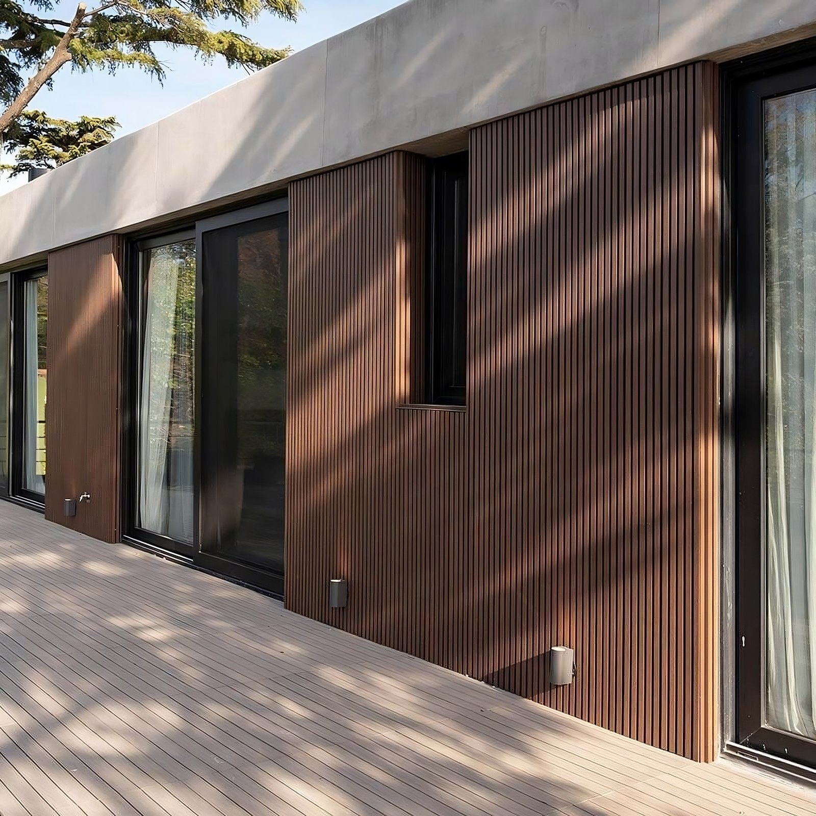 Revestimientos tipo duela de WPC (madera plástica) para revestir tus muros interiores o exteriores. Dan la calidez de la madera con gran durabilidad: resisten intemperie, humedad y plagas, sin el mantenimiento de la madera natural.
